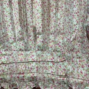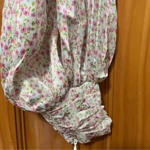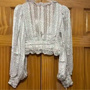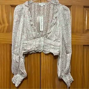 This elegant blouse features a charming ruffled design with long sleeves, offering a romantic and stylish look. The pink and green hues add a vibrant touch, while the cropped fit and buttoned details enhance its modern appeal. Perfect for adding a feminine flair to any outfit.