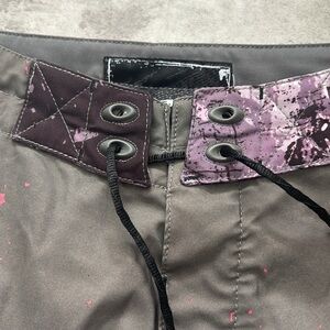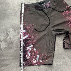 Dive into style with Oakley men's swim shorts featuring a striking pink and gray design. Perfect for a day at the beach or pool. Good condition, thick fabric, no lining. 23 inches long, waist size 32, wide leg opening.
