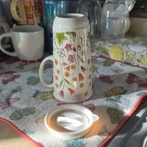 Charming ceramic mug with vibrant floral design. Features red, orange, and green flowers.