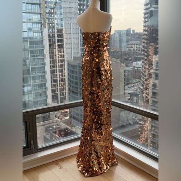 🧿🧿 BRONX & BANCO Farah Strapless Sequins Gown Dazzle in Bronx & Banco's Farah Strapless Sequins Gown in Bronze, the epitome of glamour and sophistication. Dramatic sequin fabric Allover sequins Train at back Zipper closure Partially lined COMPOSITION Shell: 100% Polyester Lining: 95% Polyester, 5% Elastane SIZE Size Large = US 8 Approximate Measurements: Bust: 45cm or 17.7in Waist: 38cm or 15in Hips: 50cm or 19.7in 🧿 NWOT Brand New, Never Worn No inclusions: no tags. As is (as pictured) MSRP $ 1300 🧿🧿🧿🧿🧿🧿🧿 ALL OUR ITEMS ARE AUTHENTIC. We are a shopping collective of friends working in the fashion industry around the world, based in Toronto 🧿 Check out our closet for more great finds to bundle and save! Every attempt is made to describe and capture our items as best and as accurately as possible, taking note of any possible flaws. Ultimately, please refer to all photos for overall condition. Please feel free to ask questions or request more photos. We film all of the packaging of our items on video, to capture how items were packed and their condition upon leaving our hands. Follow us on IG @the.procuress Happy shopping, The Procuress 🧿