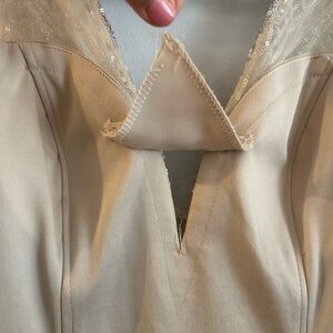 I had this dress altered and cut on the bottom for me. You can tell on the shoulders straps where we had to take it in. I am petite 5’2 and weight 138. I also added a little piece of fabric in the front to minimize a little bit of the cleavage.