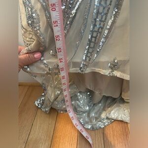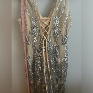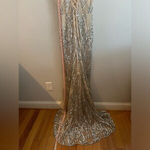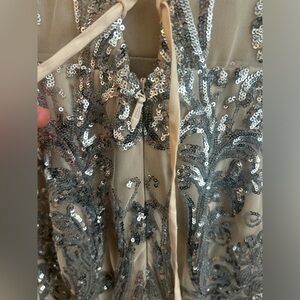 Stunning gown with intricate silver sequin detailing. Features a lace-up back for a perfect fit.