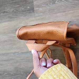 Stylish brown leather backpack with a secure clasp. Perfect for everyday use. In good used condition there is a wear in the corner see it in the picture. Note (stain inside) Please review all the photos, conditions, and measurements before purchasing.