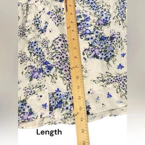 Floral shorts by philosophy. Purple and blue floral pattern against a white background. Hems are slightly ruffled and the front is flat with elastic waistband in the back.