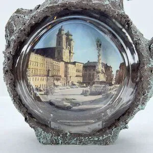 This handcrafted glass bottle features a scenic Austrian photo encased within a textured tree bark-like design. Its wooden cork stopper adds rustic charm.