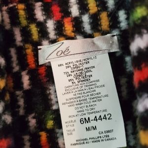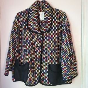 Features:Preowned. In good condition. Tweed, knit button front blazer. Multicolored. Pockets. Long-sleeved.