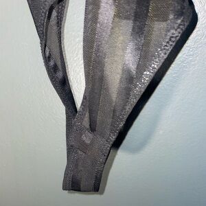 Elegant black lace lingerie bodysuit with sheer striped design.