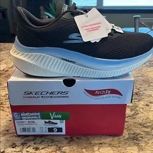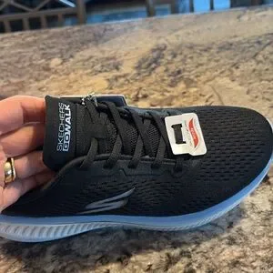 Experience comfort with Skechers womens black walking shoes. Featuring Arch Fit technology for superior support. New in box! Didn’t fit. They are not a tie shoe. You could put in regular shoe laces