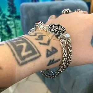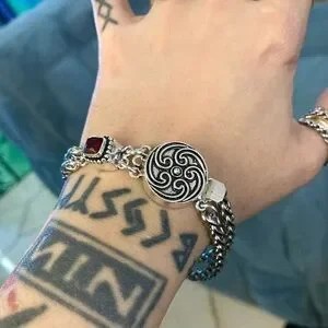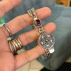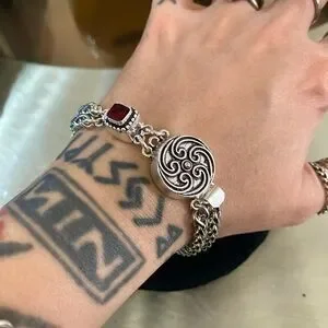 This elegant women's bracelet features intricate silver detailing and a striking red garnet gemstone. Perfect for adding a touch of sophistication to any outfit. Handmade gemstones wheat bracelet . Bracelet is 7.25 inch long . Genuine natural red garnet stone . If you need a different lenght let me know before purchase thank you ! Wheat Chains on bracelet are 5mm thick and stainless steel material ( allergy free / nickel free / do not change color ) Gemstone clasp and silver Celtic round clasp charm are silver plated rust resistant material . Tags : gem / gems / gemstones / natural healing stones & crystals / boho / bohemian / boho chic / gypsie / hippie/ festival / goth / Viking/ Celt / Celtic/ Bali / indie / rock chic / biker / gift / Xmas / stylish/ trendy/ casual / fairy / mermaid / silver bracelets / night out / date night/ urban / girl night out / easy clasp bracelets/ press on clasp / party / clubbing / st valentine / Mother’s Day / zen / yoga / cable / designer/ thick silver bracelets / dainty/ elegant / chic