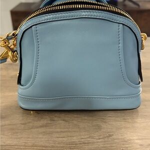 This Moschino mini bag in a soft pastel blue captures the essence of a biker jacket with its unique design. Adorned with gold-colored zippers and studs, it offers a chic and edgy look. Its compact dome shape makes it a stylish and versatile accessory for any occasion.