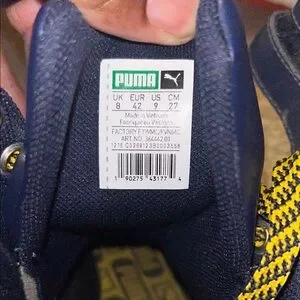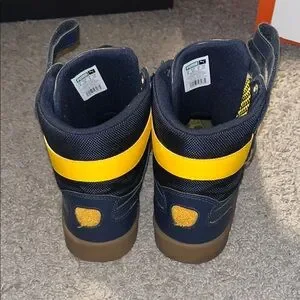 Stylish Puma Sky high-top sneakers with navy and yellow design. Features gum sole and dual straps.