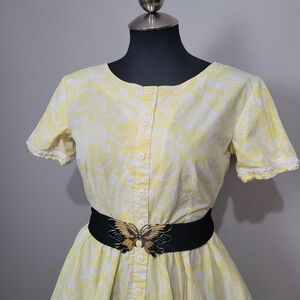 Lilly Pulitzer is a prep icon, known for her bold prints and fun colours. This dress from the 1980s is a slight departure from her well known bold shift dresses, featuring a light butter yellow floral print, shown on a 1980s does 1950s classic fit and flare shirt dress style.