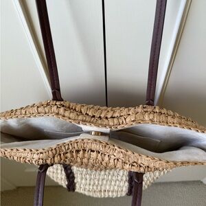 The bag is crafted from woven straw material, with a two-toned design, the upper portion in a natural straw color and the lower section in an off-white. It has dark brown leather straps that are braided and attached to the bag with gold-toned hardware.