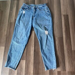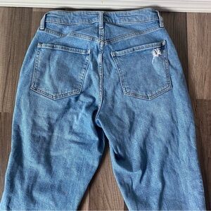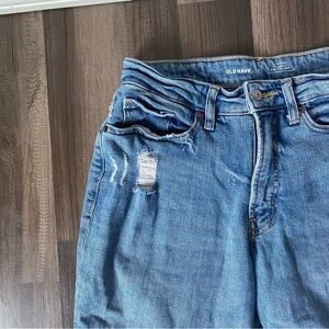 These Old Navy jeans showcase a classic blue hue with a relaxed fit, offering both style and comfort. The ankle-cropped design adds a contemporary flair, making them perfect for everyday wear. The distressed detailing on the thigh enhances their trendy appeal.