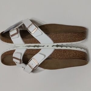 This article is brand new. color is white. birko flor upper. adjustable straps. eva sole. tried on only. just sitting in the closet. sorry no box. unisex w9 m7 eu40