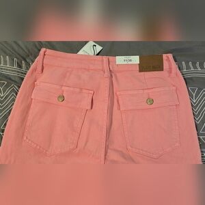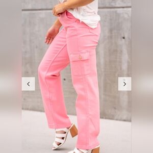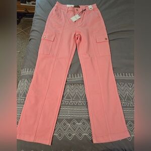 Brand new with tags. Size 11/30. Light pink in color. High rise straight leg cargo jeans. Very stretchy. Front, back and thigh pockets. Measurements and fabric content listed above in pictures.