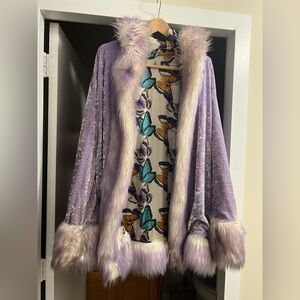 Stay cozy and stylish with this lavender coat featuring luxurious faux fur trim. with butterfly exterior