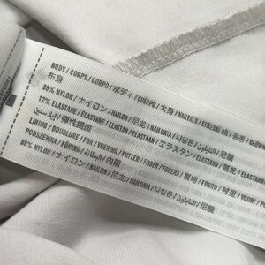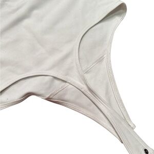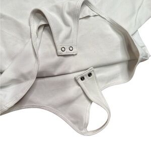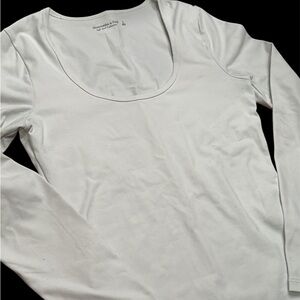 This white bodysuit from Abercrombie & Fitch showcases a fitted silhouette with a wide scoop neckline and long sleeves. Made from a soft, stretchy fabric, it ensures comfort and a sleek look, perfect for layering or wearing on its own.
