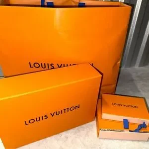 Set of Louis Vuitton gift boxes. Bright orange color. Includes ribbon detail. One large box, two small and one gift bag.