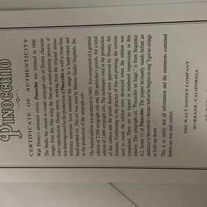 Framed Pinocchio animation art with a gold frame. Features vibrant colors and classic design.