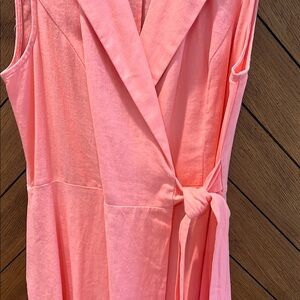 Elevate your style with this sleeveless coral wrap dress. Perfect for any occasion, this dress offers a flattering fit and vibrant color. Midi length. Hooks and button on inside keep the warp dress in place. Linen blend. Pit to pit 18 inches. Size 6. Color is a peach - coral. From a smoke and pet free house.