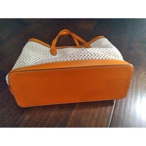 Keywords: woven tote bag, tan leather trim, beach bag, summer handbag, straw tote, woven handbag, casual tote, stylish tote, women's tote bag, beige tote, orange trim bag, market bag, shoulder bag