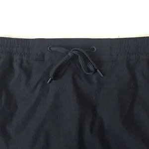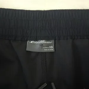 Black. Spandex Shorts built-in underneath. Hand pockets. Third front pockets with zipper closure. Eddie Bauer name at the back in white. Full elastic waistband with tie for comfort and perfect fit.