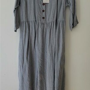 Stylish pale blue button-down maxi dress by Pyne & Smith. Features brown buttons for a classic look. 100% linen