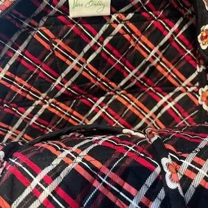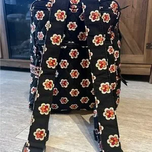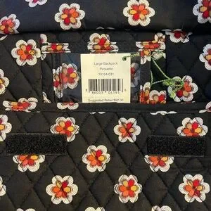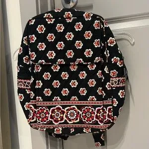 The Vera Bradley pirouette backpack features an outside Velcro pocket, 2 outside slip pockets on either side, and a large main compartment. Additionally there is a small pocket inside the main compartment to hold essentials as well as a zipper pocket on the back. It is made of a quilted material with a black background and a beautiful red pattern.