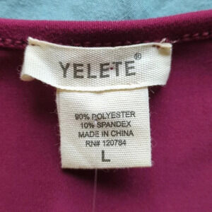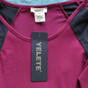 Long, lean silhouette, with flattering colorblock design. Burgundy front and back, black on the sides.