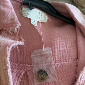 Stylish pink button-up shirt with frayed edges. Perfect for casual wear. Oil and Hali. Never worn no tags. Distressed pale pink. Can button the front or leave open. Long sleeve lightweight.