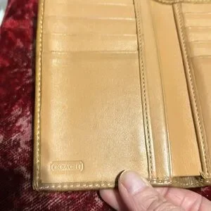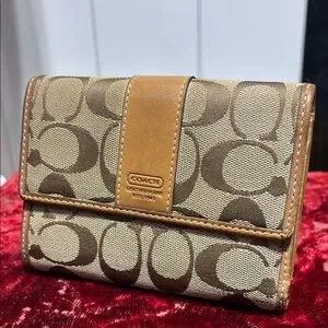Coach trifold Signature “C” wallet, brown leather accents, card holders, 3 compartments on one side with an additional zippered pocket, excellent used condition