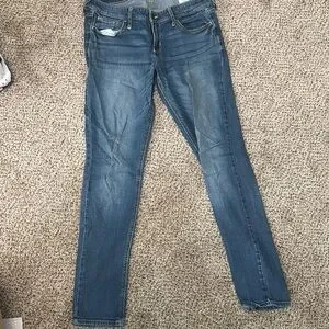 These Hollister skinny jeans feature a medium blue wash with a slightly faded look, offering a stylish and comfortable fit. The denim's subtle whiskering patterns add a casual, lived-in aesthetic, perfect for everyday wear.