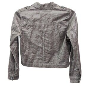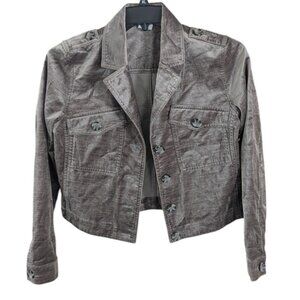 CAbi’s Sunday Topper jacket, button front, flap button chest pockets, button tab on shoulders, velvety sheen, lightweight, buttoned cuffs, cropped