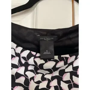 This is a pre-owned Ann Taylor Factory dress, size 6. The dress features a black and white abstract pattern. It is sleeveless with a round neckline and a gathered detail at the waist. The dress measures approximately 38 inches in length and 19 inches across the bust.