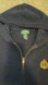 Stylish navy hooded zip-up sweater with embroidered emblem. Perfect for casual wear.