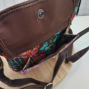 Relic Crossbody Purse Canvas & Faux Leather Trim Brown Floral & Stripes Small
