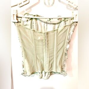 Stunning, dainty & feminine - this light mint green corset style bustier top by Victorias Secret features delicate rosebud floral embroidery, adjustable multi-hook and eye back closure, scalloped edge, and V shape waist.