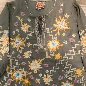 Johnny Was - Embroidered Olive Green Tunic Top in Size S. 100% Linen with 10% Polyester Trim; Machine Washable. Excellent Condition; barely worn.