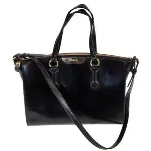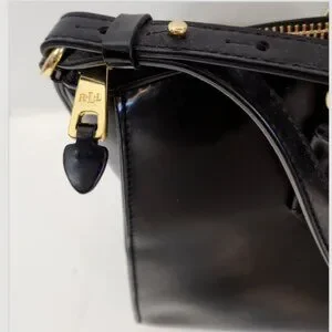 LRL Lauren RALPH LAUREN BLACK GLAZED LEATHER HAND BAG with GOLD Logo HARDWARE Satchel Double Handle Purse. Zip closure across top of bag. Excellent pre owned condition. No stains, rips or tears. A slight hairline impression line just under logo at top of one side of bag. See all pic.