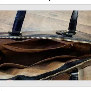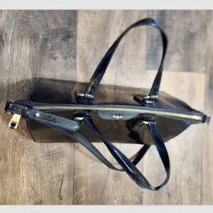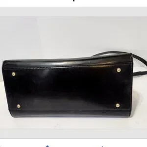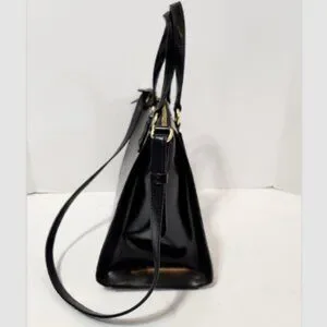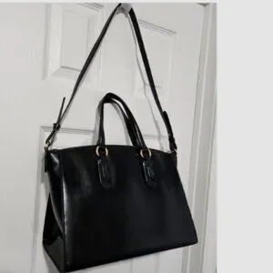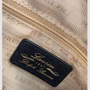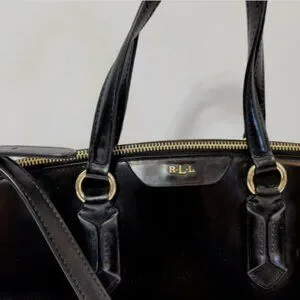 This classic Lauren Ralph Lauren satchel/top handle bag in classic black leather features gold hardware and a glazed finish. With a zip closure, the bag has a 9.25" height, 13-inch width, and 6.5" inch depth at side at base, providing ample space for everyday use. The black exterior is complemented by a beige fabric lining, offering a stylish contrast. The timeless design and quality materials make this handbag a versatile and elegant accessory for women who appreciate classic style. Double handles have a drop length of 5". The shoulder strap drop is approx. 14" ( at least at the current setting). One inner zippered pocket and 2 open pockets on inner lining.