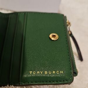 This Tory Burch wallet features a sophisticated geometric pattern in green and white, crafted from high-quality materials for a luxurious feel. The bold design is complemented by a metallic gold emblem, adding a touch of elegance to this stylish accessory.