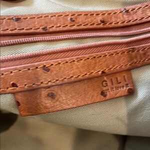 This G.I.L.I. hobo bag in a warm tan color showcases a luxurious ostrich-embossed texture, offering a unique and stylish look. Its slouchy silhouette and gold-toned hardware add a touch of elegance, making it a versatile accessory for any occasion. The decorative tassel enhances its chic appeal, ensuring you stand out wherever you go.