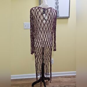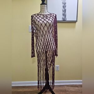 Dress made of macramé with round neck and long sleeves. Fringed trim. Unlined.