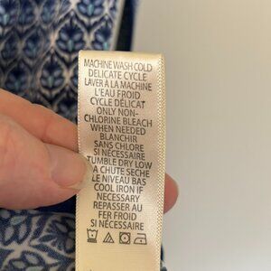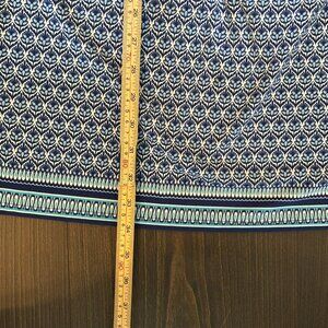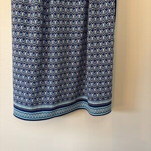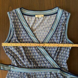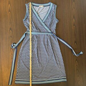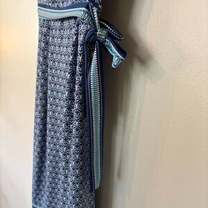 This Max Studio sleeveless wrap dress in size XS is the perfect blend of comfort and style. Made with a stretchy, soft material, it features a beautiful geometric blue and white print with contrasting trim. The flattering wrap silhouette ties at the waist, making it ideal for casual outings, workwear, or summer events.