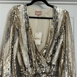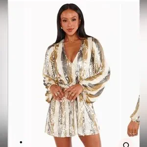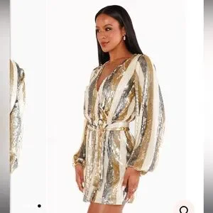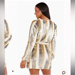 Dance the night away in our champagne sequin stripe mini dress. With it's elastic waistband, cinching tie at the waist, and long bubble sleeves this mock wrap mini dress is as easy to wear as is it fun!