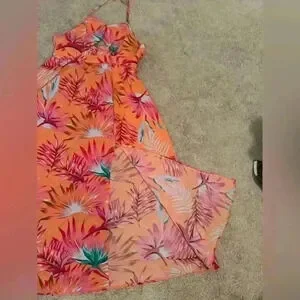 Beautiful birds of paradise sundress for women in size large. Tie neck and open tie back. Pit to pit is adjustable as it is a tie back. Key hole detail on the chest. Slit on the side of the skirt. Measurements with tie (pictured) 19 inches but is adjustable. From waist to bottom of skirt is 36 inches.