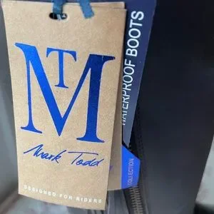 Mark Todd dark brown riding tall leather boots with side zipper and buckle detail.