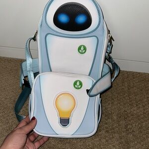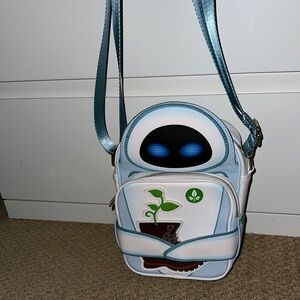 Stylish crossbody bag featuring a Wall-E Eve design. Blue and white colors with a plant graphic. Perfect for casual outings. Brand New, never been used. no tags.