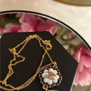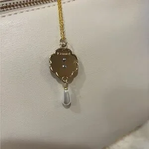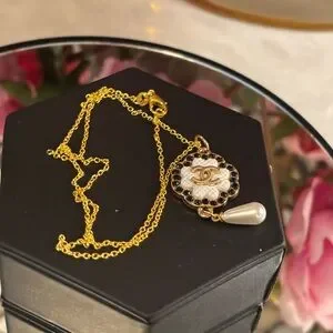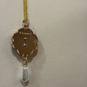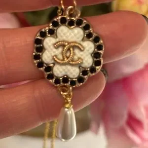 Elegant pendant featuring a gold and black design with faux pearl. Perfect for adding a touch of luxury to any outfit.
